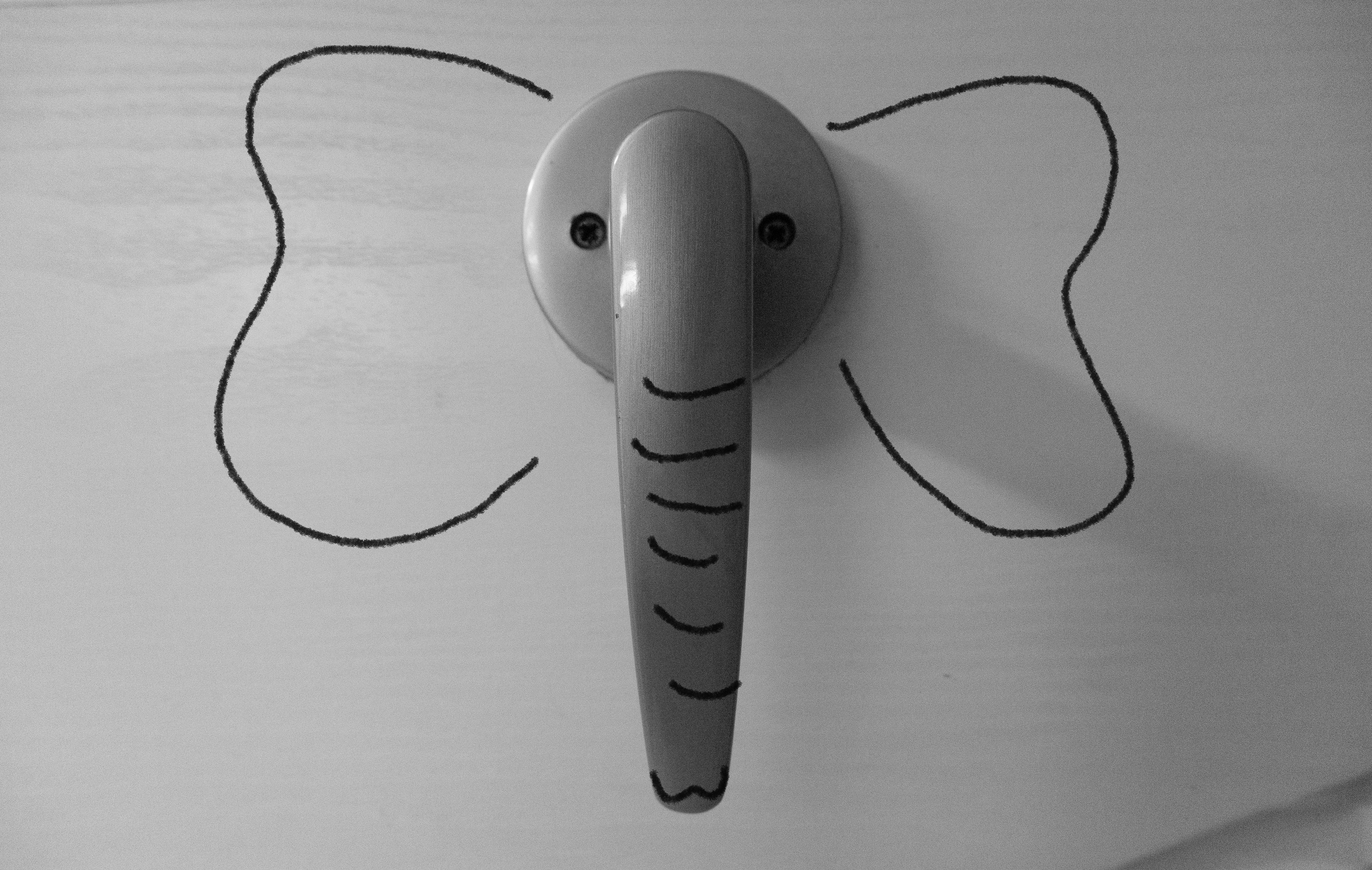 아기 코끼리가 사람에게 장난치는 영상을 본 뒤로 코끼리를 키우고 싶어졌다. 코끼리 아저씨는 코가 손이라더니 우리 집에 사는 코끼리는 코가 손잡이이다. 원룸에는 제대로 된 문이라곤 화장실 문뿐인데, 마침 문 손잡이가 기다랗고 두 개의 나사가 드러나 있어 코끼리로 만들어주기로 했다. 세상에서 제일 작은 코끼리 아저씨와 이야기하기 위해서는 허리를 숙이는 과정이 필요하다. 고개도 오른쪽으로 90도 꺾고, 마음을 착하게 먹어야 한다. 한번 안면을 튼 이후로는 매일매일 볼 수 있으니 첫인상이 중요하다. 코끼리가 특별히 좋아하는 것은 따뜻한 물로 샤워하는 것이고, 싫어하는 것은 어두운 화상실에 홀로 있는 것이다. 문을 살짝 열어두면 안심한다.