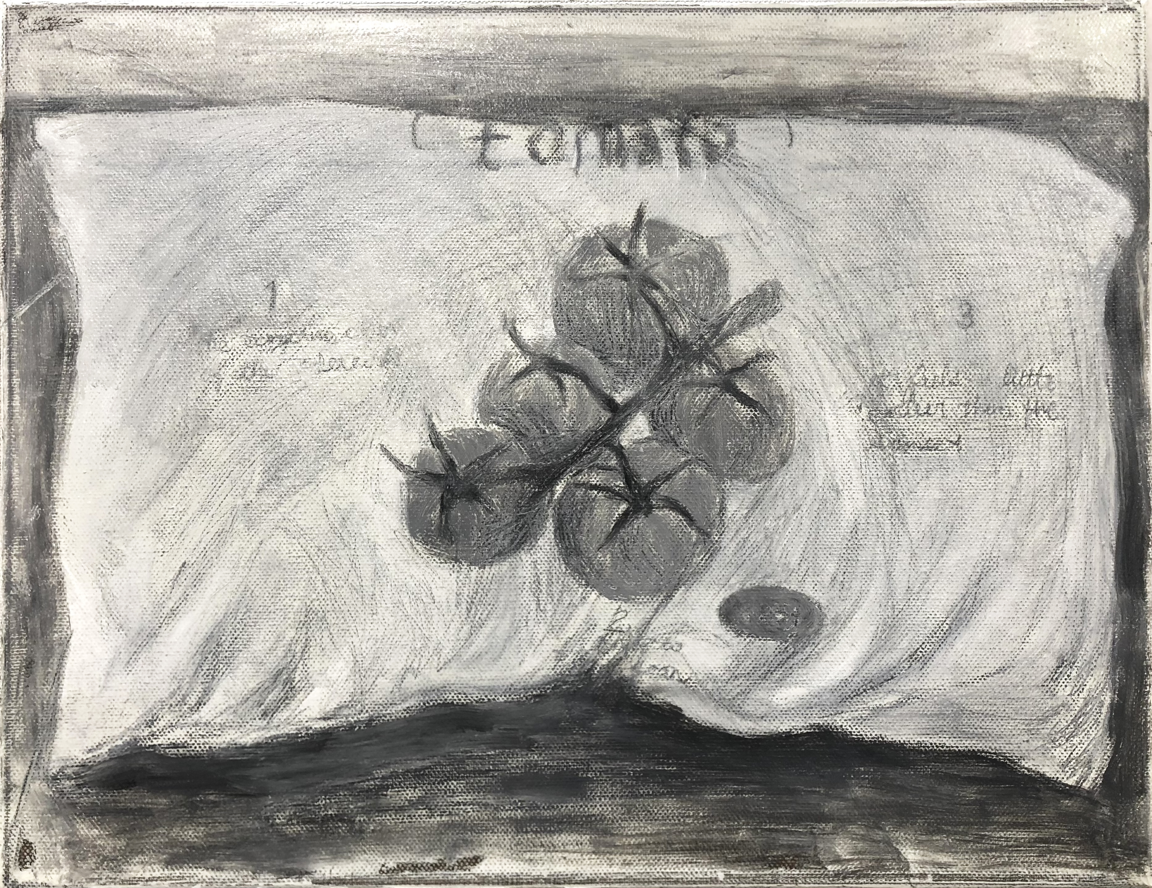 토마토 베개, 캔버스에 유화 & 연필, 40.9cm x 31.8cm